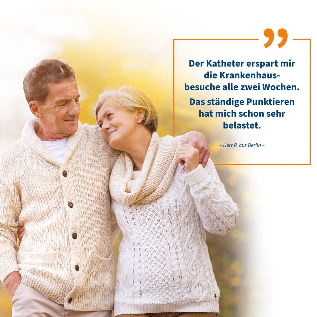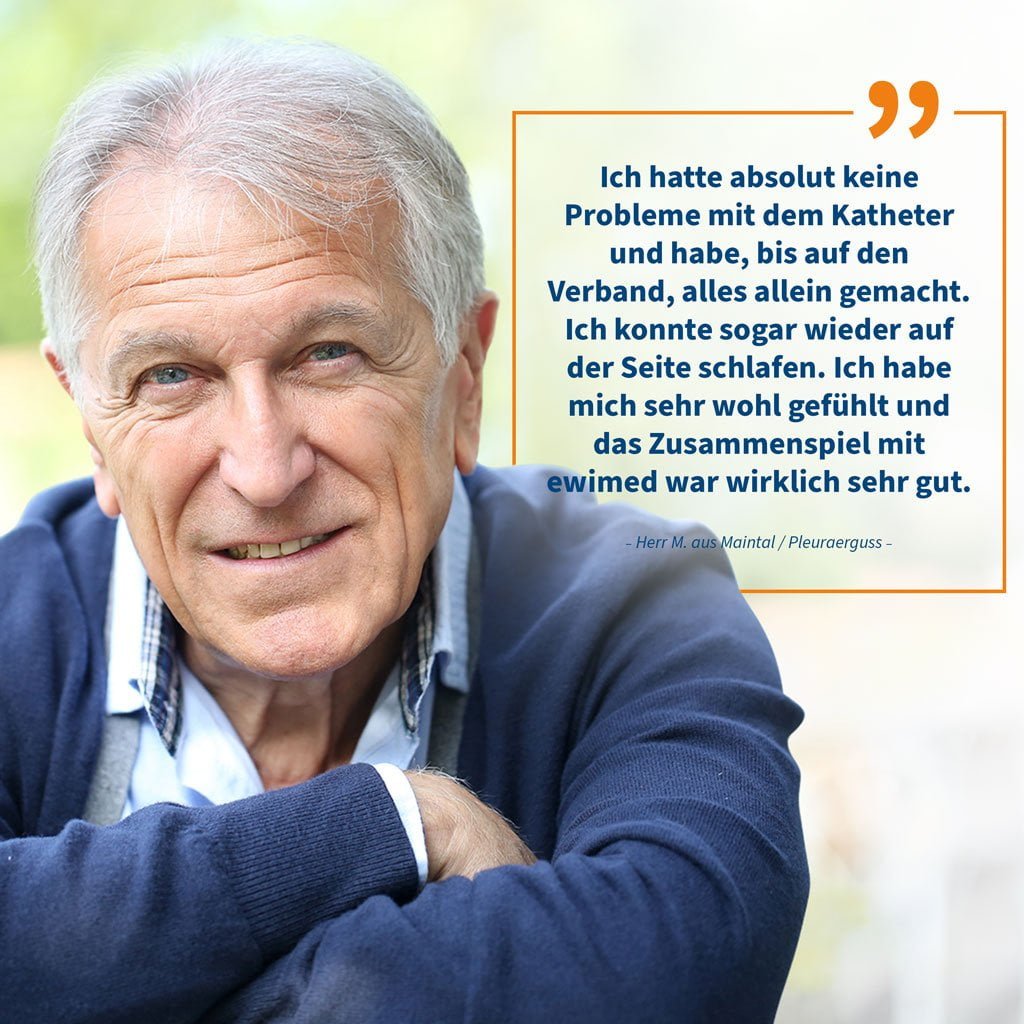 Um den Patienten die eine Chance auf Selbstverwirklichung zurückzugeben, gibt es unsere Möglichkeit der zeiteffizienten Heimdrainage mittels eines subkutan getunnelten Katheters. Der Patient kann mit diesem Drainage-System selbst, mit Hilfe von Angehörigen oder einer Pflegekraft, den Erguss im häuslichen Umfeld drainieren. Der Arzt entscheidet, welche Kathetervariante aus unserem Produktportfolio individuell zu den Patientenbedürfnissen implantiert wird. Durch einen minimalinvasiven Eingriff wird einmalig und nachhaltig ein Dauerkatheter eingesetzt. Anschließend wird der Patienten in eine mobile und lebensqualitäterhaltende Zukunft entlassen. Ab jetzt greift das ewimed-Versorgungskonzept mit all unseren Experten und Schulungsmitarbeitern, welches den Patienten nach dem Klinikaufenthalt bestens betreut und versorgt. Ein absolutes Plus an Lebensqualität. Und zwar für alle Beteiligten!
