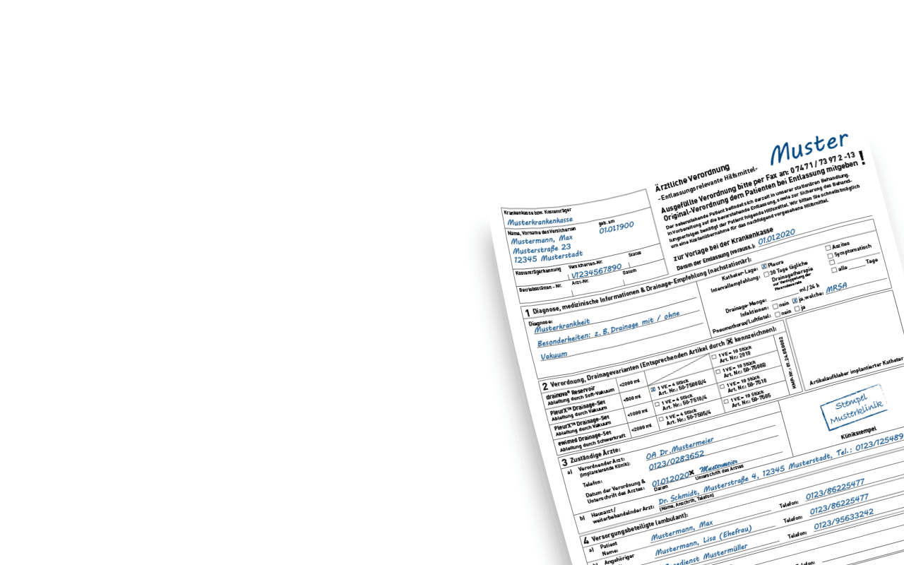 Damit eine lückenlose Versorgung Ihres Patienten gewährleistet ist und er zur Drainage der Ergüsse eine Schulung und Drainage-Material von uns erhält, möchten wir Sie bitten, folgenden Schritten unseres Entlassmanagements zu folgen: