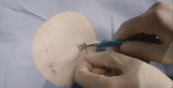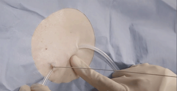 9 | Tunneln des Katheters Richtung Führungsdraht (von zweiter zu erster Stichinzision). Polyestermanschette vorerst in der Mitte des Tunnels platzieren.