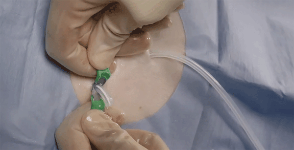 12 | Splitschleuse aufbrechen und nach und nach entfernen. Dabei den Katheter auf Position halten. Abschließende Positionierung der Katheterlage. Die Manschette soll ca. 1 cm vor dem Austritt aus dem Tunnel platziert werden.