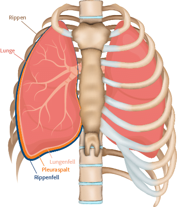 Die Pleura (Brustfell) ist eine dünne, zweiblättrige Haut im Brustkorb. Die innere Haut überzieht die Lungenoberfläche und wird Lungenfell (Pleura visceralis) genannt. Die äußere Haut, das Rippenfell (Pleura parietalis), kleidet die Innenfläche des Brustkorbs aus. Dazwischen befindet sich der Pleuraspalt. Dieser Spalt ist mit wenigen Mililitern Flüssigkeit gefüllt, sodass das Rippen- und Lungenfell bei allen Atembewegungen aneinanderhaften – vergleichbar mit zwei Glasscheiben, zwischen denen sich ein Flüssigkeitsfilm befindet.